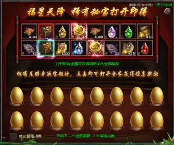 活动说明:活动期间将玩家可以使用福运宝锤进行砸金蛋,打开所有金蛋可以获得展示中的全部奖励。