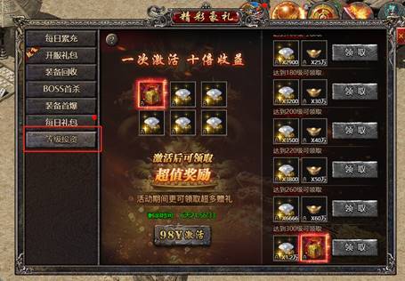 活动范围:活动说明:活动期间,玩家可以激活该投资领取超值丰厚的奖励。