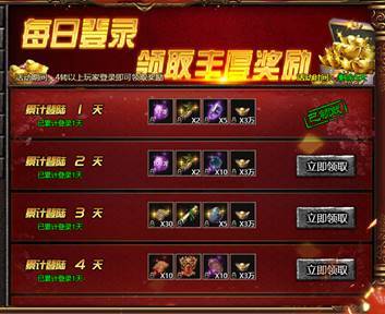 活动说明:活动期间,4转以上玩家累计登录即可领取奖励。