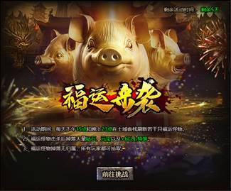 活动说明:每天下午15点和晚上23点在土城客栈刷新福运金猪,击杀后将会掉落大量钻石以及特装。