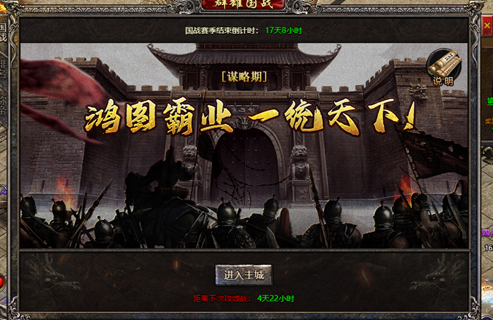 玩法说明:群雄国战周日开启新赛季,每个赛季持续28天;其中每周一 三 五 14:55-16:00为征战期,其余时间为谋略期