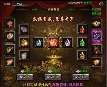 活动说明:活动期间将开启限定寻宝,玩家可以通过探宝获得奖池中的奖励,奖池中的金龙鳞可以兑换霸王装备!!