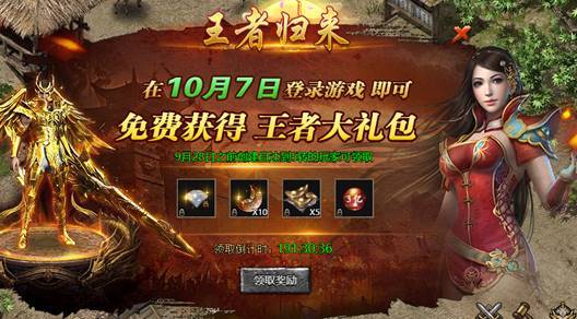 活动说明:角色条件满足9月28日之前创建且转生等级到达5转的玩家即可在10月7日当天登录游戏免费获得王者大礼包。