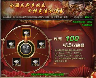 活动说明:活动期间玩家每日充值达到条件即可抽取大量钻石奖励,每天重置抽取机会。