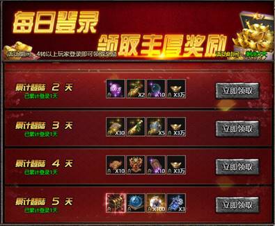 活动说明:活动期间,4转以上玩家累计登录即可领取奖励。