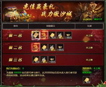 活动说明:活动期间玩家累计充值达到指金额即可进入排行榜,活动结束时根据排名获得相应的奖励。
