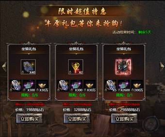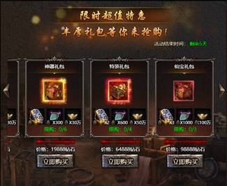 活动说明:活动期间将上架限购礼包,限时上架供玩家购买。