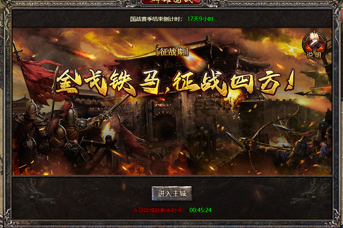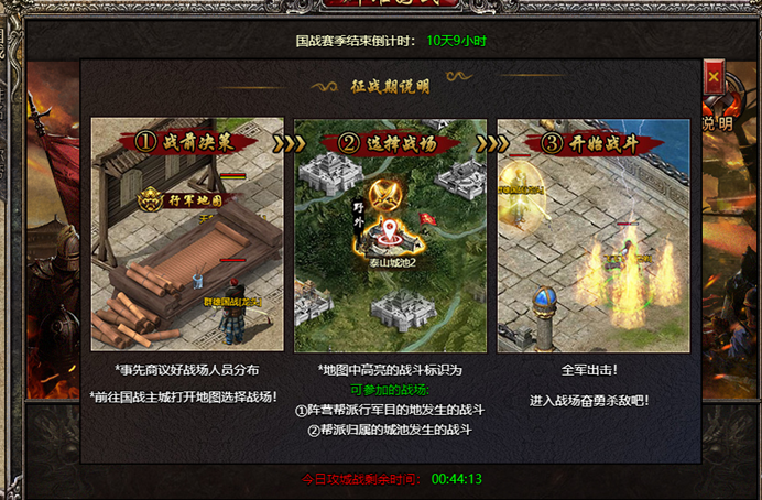 玩法说明:群雄国战周日开启新赛季,每个赛季持续28天;其中每周一 三 五 14:55-16:00为征战期,其余时间为谋略期