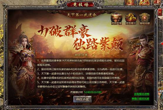 报名时间:竞技场赛季的第15天开放报名,以报名开始时的竞技场排名为准,前100名的玩家可进行报名