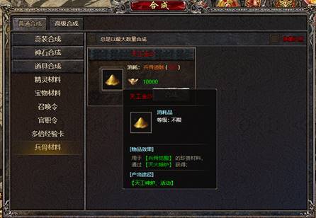 2、新增“天工金沙”道具合成,用于兵骨觉醒。