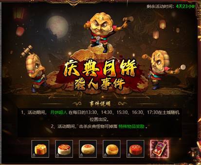 活动说明:在活动期间,月饼超人将在每日指定时间点在土城随机刷新,击杀月饼超人将获得特殊奖励,更有概率掉落“意逍遥”称号。