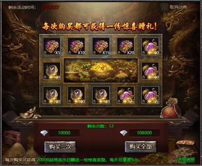 活动说明:活动期间玩家可使用钻石购买战场龙币,每次购买都将获得展示中的一种奖励。